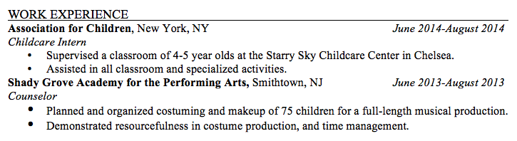 • Supervised a classroom of 4-5 year olds at the Starry Sky Childcare Center in Chelsea. = the first description, using bullet points, starting with a past-tense action verb, giving a description of where and what the organization way